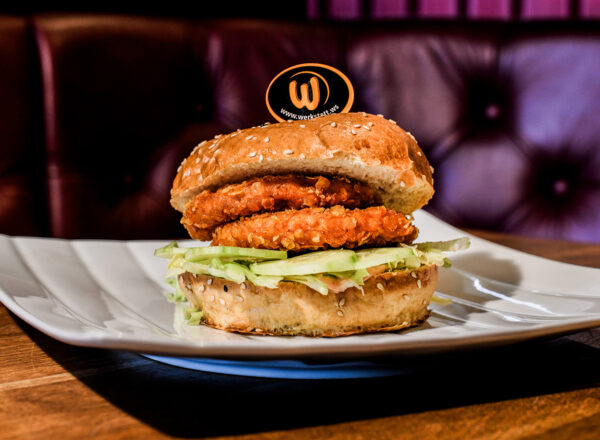 mit knusprigem Gemüselaibchen, Eisbergsalat, Tomaten, Gurken, Käse und Cocktailsauce