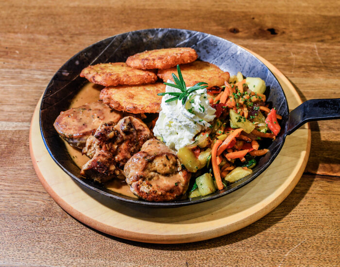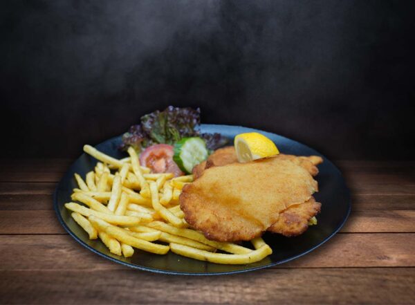 Wiener Schnitzel vom Schwein, gegrillte Medaillons vom Rind & Huhn dazu Pommes frites, gebackene Zwiebelringe, Speck, Kräuterbutter und verschiedene Dips