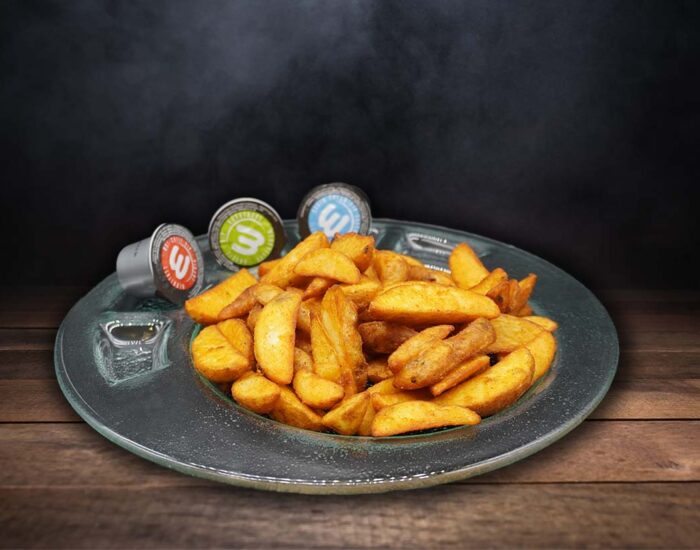 Wedges, Wings, Zwiebelringe, Maiskolben und Mozzarellasticks, dazu verschiedene Dips