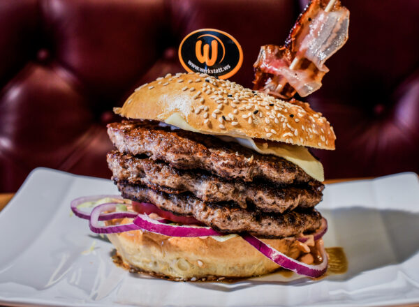doppelter Rindfleischburger auf Eisbergsalat mit Paprika, Tomaten, Speck, Zwiebeln, Cocktailsauce und Käse