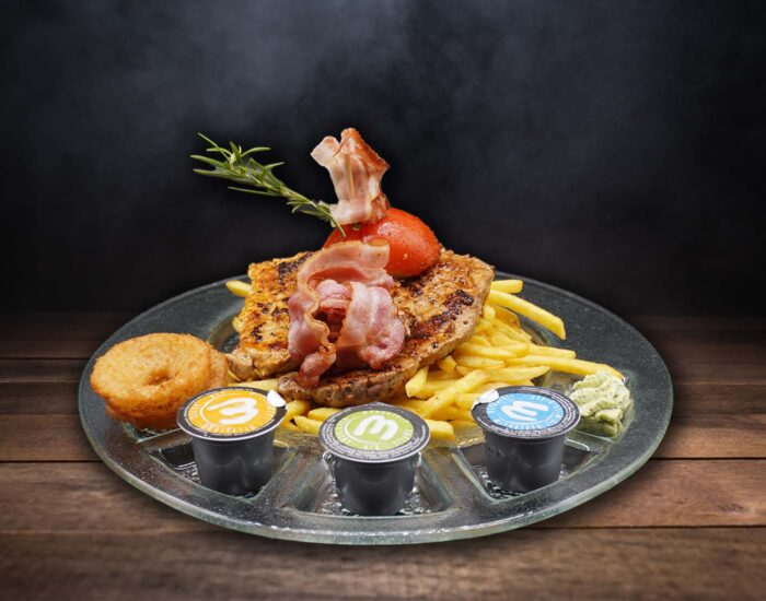 Medaillons vom Schwein, Rind und Huhn mit Pommes frites, geb. Zwiebelringen, Speck, Kräuterbutter und verschiedenen Dips