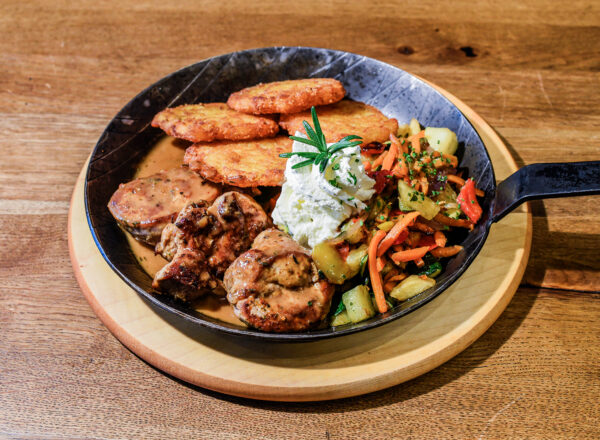 zart-rosa gegrillte Schweinemedaillions mit Rahmsauce, Rösti und buntem Gemüse