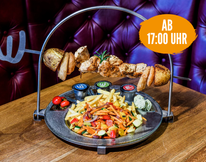 mit Hühnerfilet, Zwiebeln, Pommes frites, Grillgemüse, Kräuterbutter, Ofenkartoffel und den pikanten Werkstatt Dips