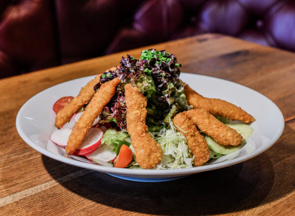 gebackene Hühnerfilets auf gemischtem Salat an Joghurtdressing